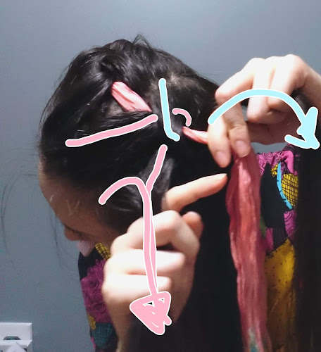 Now you will need to pick up another section of hair from the front (as before, just lower down on your head), combine it with the first front section (pink) and wrap it around the scarf as before. This sounds a bit confusing, but it is the same concept as doing a French braid.